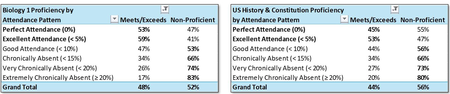 The impact of attendance on 9th to 12th grade testing is reflected in the chart showing End of Course Biology I and End of Course US History & Constitution scores.